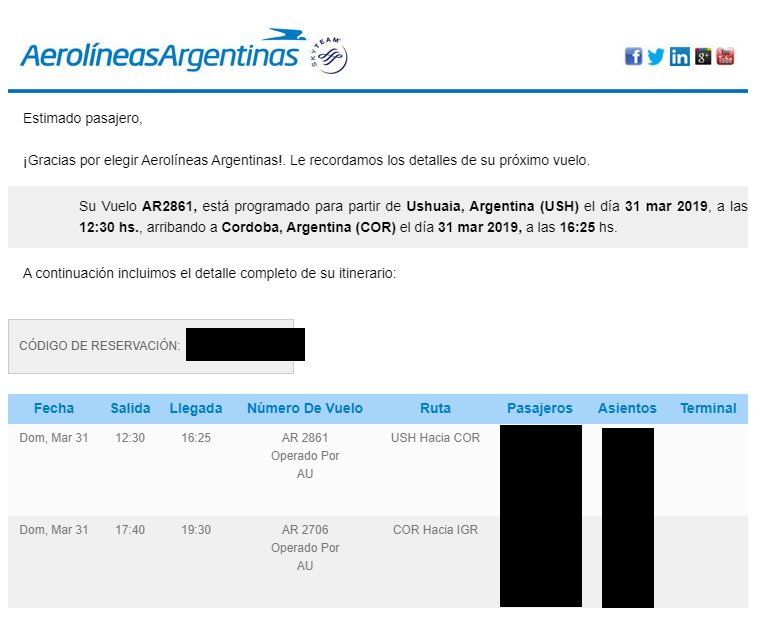 푸에르토 이과수로 떠나기 전 날, 아르헨티나에서 날아온 컨펌메일. 우수아이아에서 코르도바까지는 약 4시간 정도, 코르도바에서 푸에르토 이과수까지는 약 2시간 정도 소요된다는 내용이었다. 환승 시간이 2시간도 채 되지 않아서 불안했는데, 경험하고 나서 느끼는 건 꽤 충분한 시간이었다는 점이다.